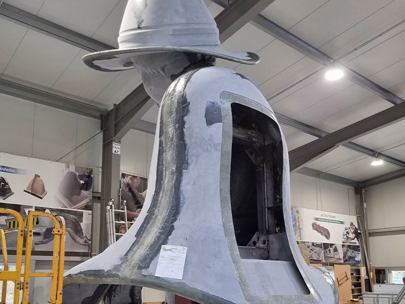 Die Fertigung dieser XXL-Figur begann mit CNC-gefrästen Negativformen aus Styropor, in der einzelne Figurenteile präzise aus GFK laminiert wurden. Das Handlaminat-Verfahren gewährleistet einen homogenen Schichtaufbau und sorgt für eine besonders hohe Witterungs- und Temperaturbeständigkeit im Außenbereich. Durch den gleichmäßigen Laminataufbau werden Materialspannungen sowie Mikrorisse in der Lackoberfläche dauerhaft vermieden.