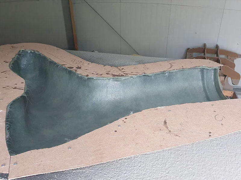 Die Laminatstärke variiert je nach Geometrie zwischen ca. 4 mm und 6 mm, ergänzt durch zusätzliche Sandwichversteifungen im Rückenbereich. Im Inneren der Skulptur sorgt ein feuerverzinktes Stahltragwerk für Stabilität und dient gleichzeitig zur sicheren Befestigung am Gebäude. Die Angelrute sowie die Angelschnur bestehen aus gebogenem und lackiertem Edelstahlrohr. Sämtliche metallischen Bauteile wurden in Zusammenarbeit mit der STAMA-Schlösserei GmbH gefertigt.
