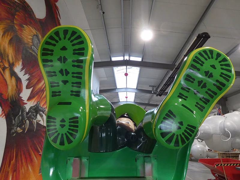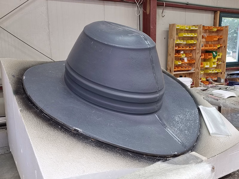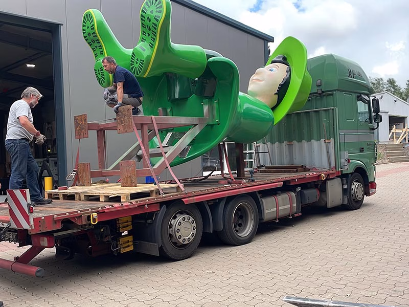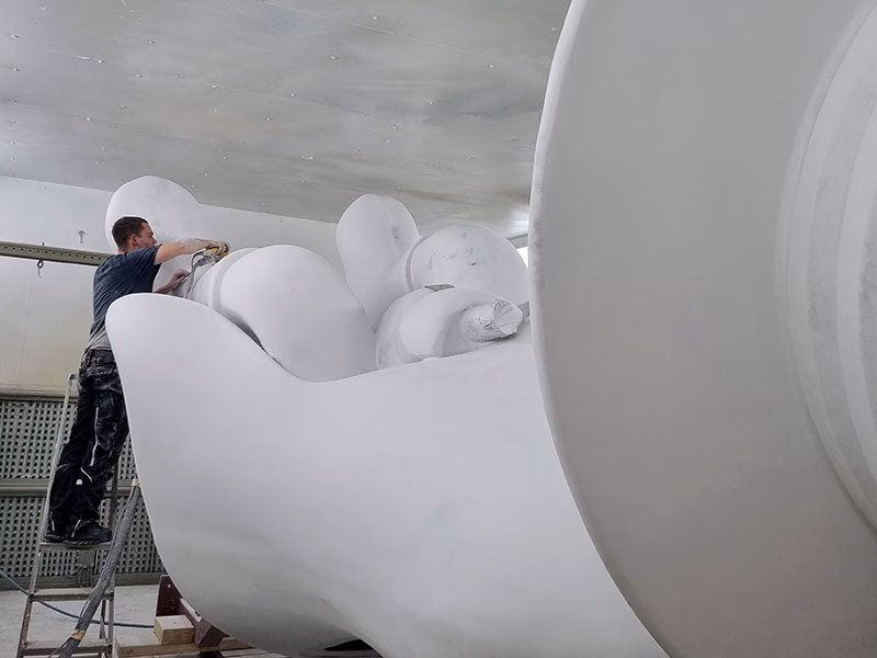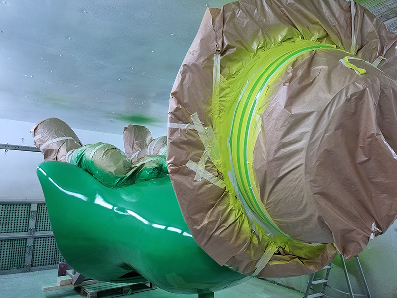 Die Fertigung dieser XXL-Figur begann mit CNC-gefrästen Negativformen aus Styropor, in der einzelne Figurenteile präzise aus GFK laminiert wurden. Das Handlaminat-Verfahren gewährleistet einen homogenen Schichtaufbau und sorgt für eine besonders hohe Witterungs- und Temperaturbeständigkeit im Außenbereich. Durch den gleichmäßigen Laminataufbau werden Materialspannungen sowie Mikrorisse in der Lackoberfläche dauerhaft vermieden.