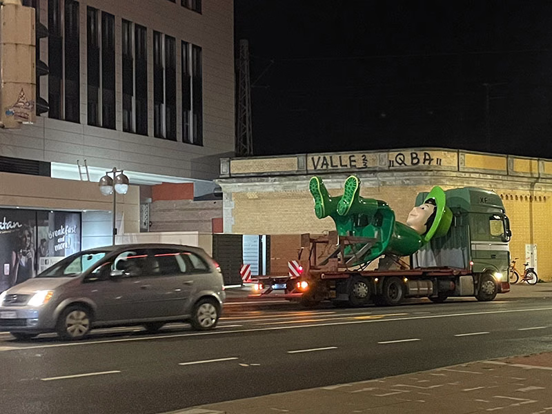 Die komplett vormontierte Großfigur aus Kunststoff mit einem Gesamtgewicht von rund 1.500 kg wurde per Tieflader nach Hannover transportiert. Die Montage auf dem Dach erfolgte innerhalb weniger Stunden in der Nacht , um den Stadtverkehr nicht zu beeinträchtigen. Die scheinbar an der Angelschnur hängenden Einkaufstüten sind statisch an der Fassade befestigt.