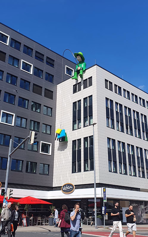 Mit dem Projekt „Der Konsumangler“ realisierte ACCENTFORM eine eindrucksvolle Großfigur aus glasfaserverstärktem Kunststoff (GFK) für den öffentlichen Raum. Die rund 5,10 Meter hohe Skulptur zeigt einen sitzenden Angler und ist auf dem Dach eines Bürogebäudes im Zentrum von Hannover positioniert. Durch ihre Größe, Farbigkeit und symbolische Aussage wird die Figur zu einem markanten Blickfang im urbanen Umfeld.
